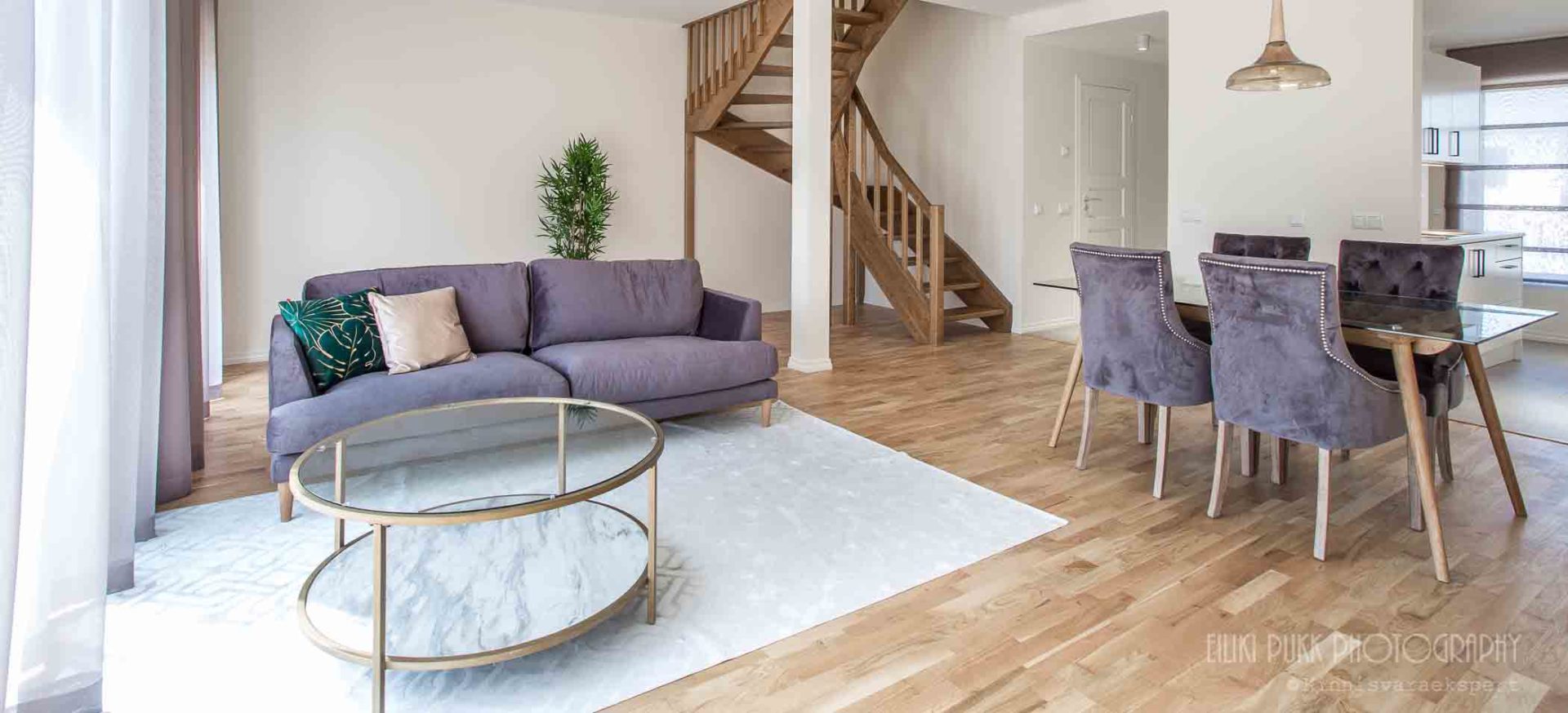 Esimesel korrusel asub avatud köök-elutuba ning pesuruum koos tualeti ja avara saunaga. Teisel korrusel paiknevad kolm magamistuba, trepihall ja uudse lahendusena privaatse rõduga vannituba.